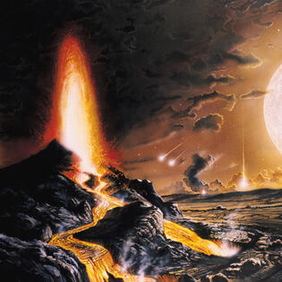 Auróš aimlessly travelled the earth for numberless years, his wanderings bringing him far from the seasonal hunting grounds of his ancestors and to places beyond the reach of any human. It was during a trek through snow-capped mountains that he took refuge in a cave on one of those frozen peaks, discovering a magnificent palace within. Having never encountered any construction greater than a simple campsite, he was instantly struck by the beauty of this ancient place, but as he marvelled death came for him more furiously than it ever had before. Before he knew it, his flesh was pierced by the claws of a great monster whose appearance had no similarities to any creature he had seen before, and its strength was just as unfamiliar; he could wrestle the greatest lions and crocodiles to death with little effort, but the beast was so utterly beyond imagining that it was only by the skin of his teeth that he managed to slay it, thereafter left near-death in the dark caverns.In his dying state, he was visited by the dwellers of this seemingly abandoned place, towering serpentine figures who walked and spoke in a manner reminiscent of men. Through some otherwordly power they restored him to health, and in hissing tones they welcomed him with due surprise, having thought humanity extinct for thousands of years. They informed him that the monster wandering the crumbling halls was placed there as a test, and in his slaying of the beast he had earned access to their hospitality all of their ancient knowledge. As he was helped to their strange food and drink, the serpent-men told him of their kind's history with the humans, how serpent and man and many stranger beings once formed great kingdoms and warred against one another. All worshipped dark, hungering gods, using the sorcerous gifts gained by total obedience and countless blood sacrifices to inflict unimaginable terrors upon one their enemies, but ultimately their constant bloodshed was for naught — all of those ancient domains were destroyed in a series of cataclysms millennia ago.